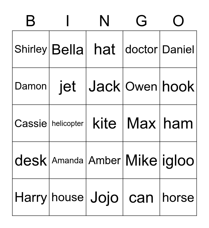 This bingo card has 25 words: Amanda, Jojo, Jack, Harry, Daniel, Shirley, Damon, Bella, Max, Amber, Owen, Cassie, Mike, igloo, jet, horse, ham, hat, hook, helicopter, kite, house, desk, doctor and can.