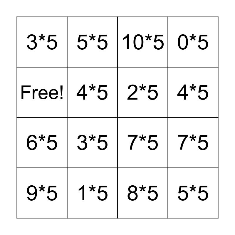 This bingo card has 16 words: 1*5, 7*5, 10*5, 3*5, 6*5, 5*5, 7*5, 8*5, Free!, 4*5, 9*5, 0*5, 3*5, 4*5, 2*5 and 5*5.