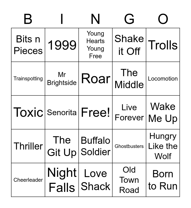 This bingo card has a free space and 73 words: Spice Girls, Ice Ice Baby, Bits n Pieces, Dance Monkey, Blinding Lights, Holiday, Thriller, Time Warp, Ghostbusters, Stranger Things, Break Up Song, Break My Heart, Mr Brightside, Wake Me Up, Thunder, 1999, Love Shack, Trainspotting, Hey Jude, Live Forever, Roar, Shake it Off, Trolls, Uptown Funk, Cheerleader, Say So, Marry You, American Pie, Saturday Night, Did I Mention, Night Falls, Frozen 2, Shut Up and Dance, New Emotion, Senorita, Shotgun, Twist and Shout, Set You Free, Born to Run, Temperature, Old Town Road, The Git Up, U Can't Touch This, Friends, 2002, The Middle, Young Hearts Young Free, We Will Rock You, Bad Moon Rising, Toxic, Hound Dog, Spirit In The Sky, Supernatural, Goovejet, Kylie, Last Night A DJ, Hula Hoop, Buffalo Soldier, Higher Love, The Power of Love, Raspberry Beret, You Can Call Me Al, Thriller, Locomotion, Pump It Up, Love Will Tear Us Apart, Karma Chameleon, Star Wars, Hungry Like the Wolf, Disturbia, Zombies 2, Shake It and Everybody.