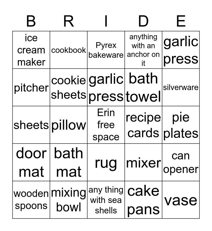 This bingo card has a free space and 24 words: bath mat, mixing bowl, garlic press, wooden spoons, garlic press, ice cream maker, pitcher, cookbook, recipe cards, rug, bath towel, sheets, mixer, can opener, cookie sheets, cake pans, pie plates, Pyrex bakeware, silverware, pillow, vase, door mat, anything with an anchor on it and any thing with sea shells.