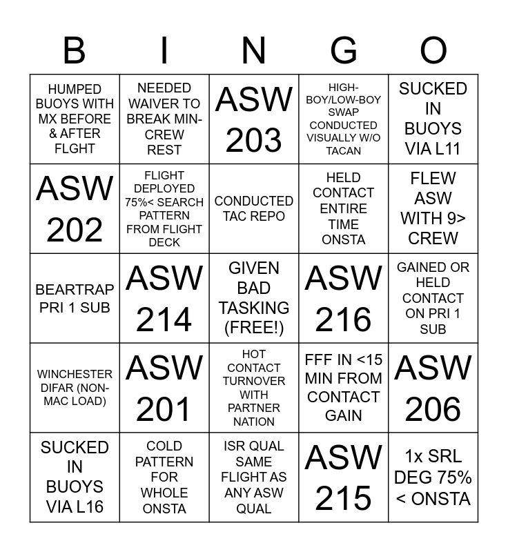 This bingo card has a free space and 24 words: ASW 201, COLD PATTERN FOR WHOLE ONSTA, CONDUCTED TAC REPO, SUCKED IN BUOYS VIA L16, SUCKED IN BUOYS VIA L11, HUMPED BUOYS WITH MX BEFORE & AFTER FLGHT, ASW 202, NEEDED WAIVER TO BREAK MIN-CREW REST, ASW 216, HOT CONTACT TURNOVER WITH PARTNER NATION, HELD CONTACT ENTIRE TIME ONSTA, BEARTRAP PRI 1 SUB, FFF IN <15 MIN FROM CONTACT GAIN, ASW 206, FLIGHT DEPLOYED 75%< SEARCH PATTERN FROM FLIGHT DECK, ASW 215, GAINED OR HELD CONTACT ON PRI 1 SUB, ASW 203, FLEW ASW WITH 9> CREW, ASW 214, 1x SRL DEG 75%< ONSTA, WINCHESTER DIFAR (NON-MAC LOAD), HIGH-BOY/LOW-BOY SWAP CONDUCTED VISUALLY W/O TACAN and ISR QUAL SAME FLIGHT AS ANY ASW QUAL.