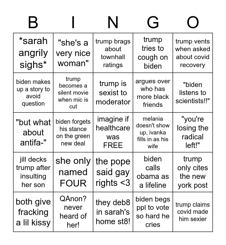 This bingo card has a free space and 24 words: she only named FOUR, QAnon? never heard of her!, trump is sexist to moderator, both give fracking a lil kissy, trump vents when asked about covid recovery, *sarah angrily sighs*, biden makes up a story to avoid question, "she's a very nice woman", melania doesn't show up, ivanka fills in as his wife, the pope said gay rights <3, argues over who has more black friends, "but what about antifa-", biden calls obama as a lifeline, trump only cites the new york post, trump becomes a silent movie when mic is cut, biden begs ppl to vote so hard he cries, "you're losing the radical left!", trump brags about townhall ratings, "biden listens to scientists!!", biden forgets his stance on the green new deal, trump claims covid made him sexier, jill decks trump after insulting her son, trump tries to cough on biden and they deb8 in sarah's home st8!.