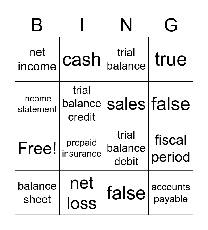 This bingo card has 20 words: fiscal period, work sheet, trial balance, adjustments, balance sheet, income statement, net loss, net income, Free!, cash, prepaid insurance, trial balance debit, trial balance credit, accounts payable, sales, true, false, true, false and advertising expense.