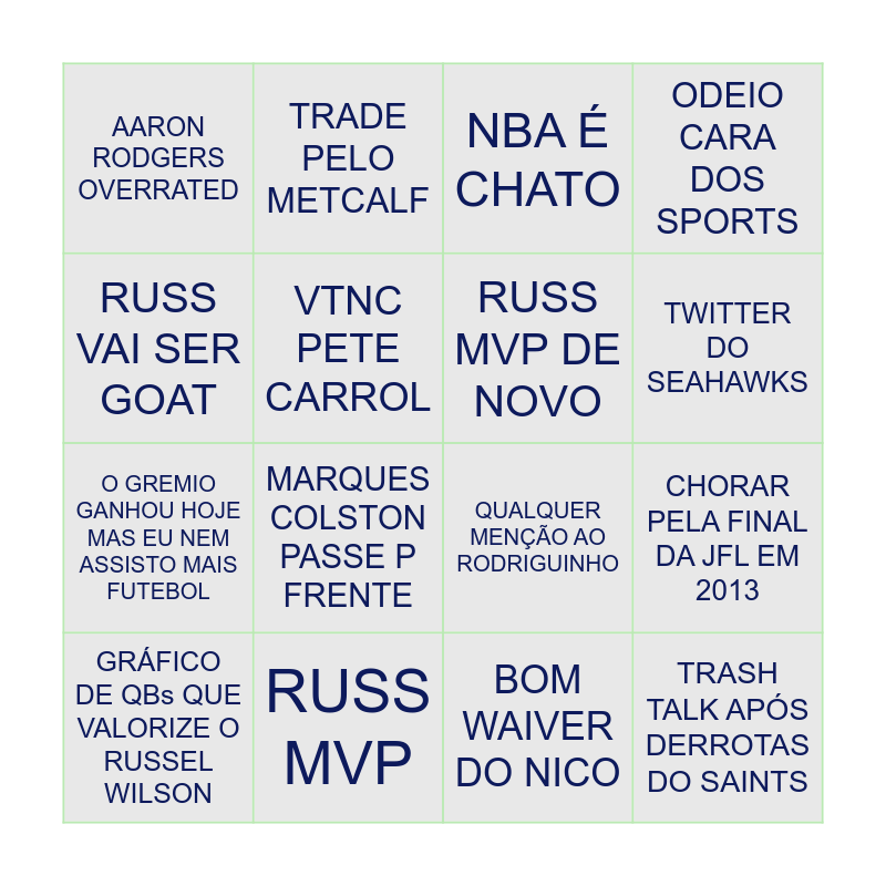 This bingo card has 16 words: RUSS MVP, CHORAR PELA FINAL DA JFL EM 2013, NBA É CHATO, AARON RODGERS OVERRATED, O GREMIO GANHOU HOJE MAS EU NEM ASSISTO MAIS FUTEBOL, TRADE PELO METCALF, QUALQUER MENÇÃO AO RODRIGUINHO, BOM WAIVER DO NICO, RUSS VAI SER GOAT, VTNC PETE CARROL, GRÁFICO DE QBs QUE VALORIZE O RUSSEL WILSON, ODEIO CARA DOS SPORTS, MARQUES COLSTON PASSE P FRENTE, TWITTER DO SEAHAWKS, RUSS MVP DE NOVO and TRASH TALK APÓS DERROTAS DO SAINTS.