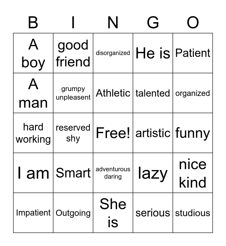 This bingo card has a free space and 24 words: Smart, Outgoing, Athletic, Impatient, Patient, A boy, A man, good friend, artistic, adventurous daring, talented, hard working, lazy, nice kind, grumpy unpleasent, serious, funny, disorganized, organized, reserved shy, studious, I am, He is and She is.