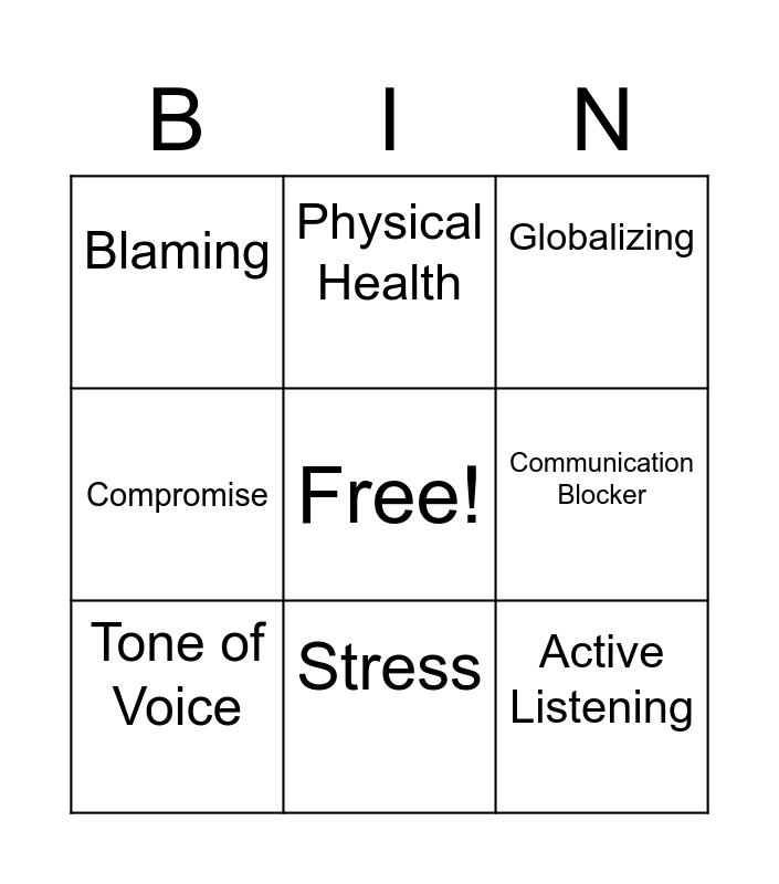 This bingo card has a free space and 8 words: Communication Blocker, Globalizing, Physical Health, Tone of Voice, Blaming, Active Listening, Compromise and Stress.