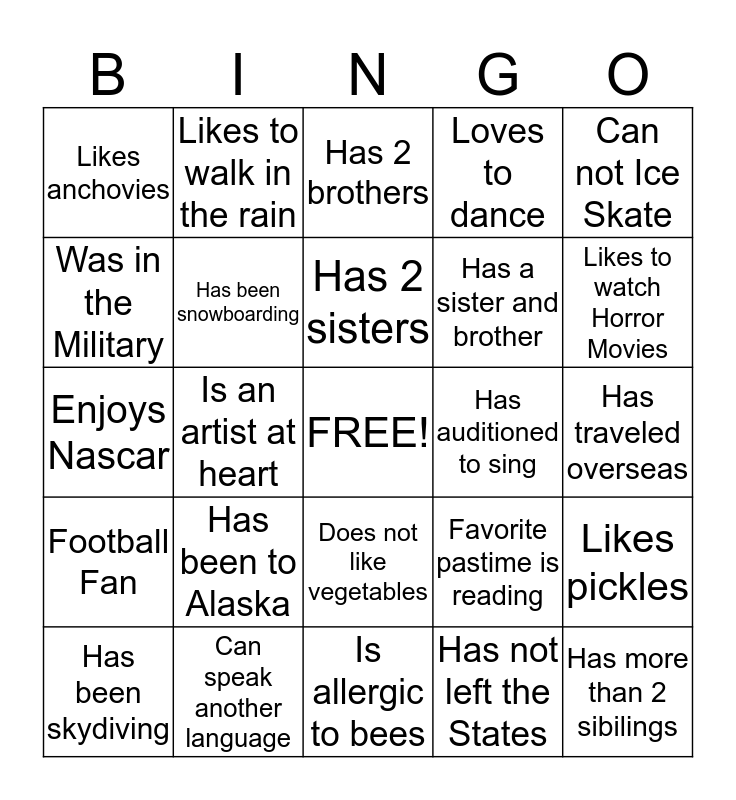 This bingo card has a free space and 24 words: Has been to Alaska, Can speak another language, Has 2 sisters, Has been skydiving, Can not Ice Skate, Likes anchovies, Was in the Military, Likes to walk in the rain, Has auditioned to sing, Does not like vegetables, Has a sister and brother, Enjoys Nascar, Favorite pastime is reading, Likes pickles, Has been snowboarding, Has not left the States, Has traveled overseas, Has 2 brothers, Likes to watch Horror Movies, Is an artist at heart, Has more than 2 sibilings, Football Fan, Loves to dance and Is allergic to bees.