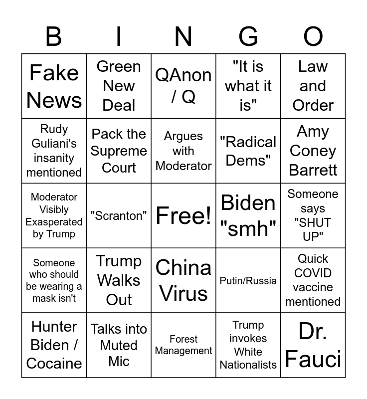 This bingo card has a free space and 24 words: Trump Walks Out, Talks into Muted Mic, Argues with Moderator, Hunter Biden / Cocaine, Law and Order, Fake News, Rudy Guliani's insanity mentioned, Green New Deal, Biden "smh", China Virus, "Radical Dems", Moderator Visibly Exasperated by Trump, Putin/Russia, Quick COVID vaccine mentioned, Pack the Supreme Court, Trump invokes White Nationalists, Someone says "SHUT UP", QAnon / Q, Amy Coney Barrett, "Scranton", Dr. Fauci, Someone who should be wearing a mask isn't, "It is what it is" and Forest Management.