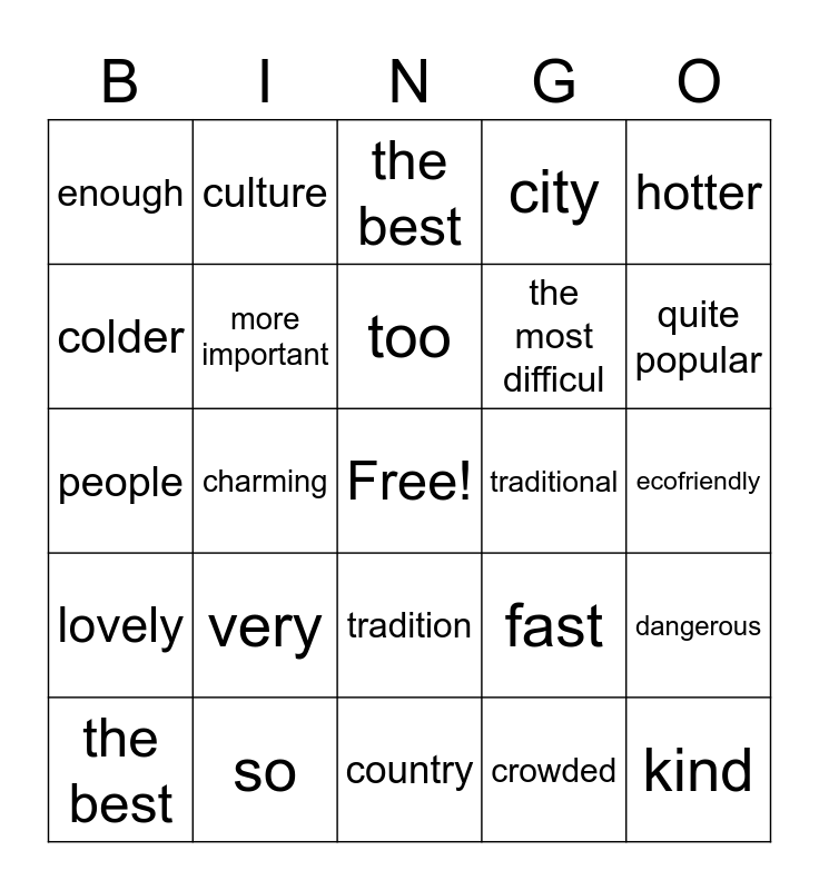 This bingo card has a free space and 24 words: very, so, too, the best, hotter, enough, colder, culture, traditional, tradition, the most difficul, people, fast, dangerous, more important, crowded, ecofriendly, the best, quite popular, charming, kind, lovely, city and country.