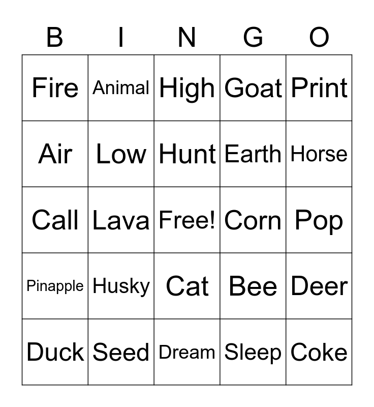 This bingo card has a free space and 29 words: Duck, Star, Lava, Water, Fire, High, Low, Husky, Corn, Seed, Pop, Coke, Dream, Sleep, Horse, Dog, Cat, Pinapple, Print, Call, Bee, Bug, Earth, Air, Goat, Animal, Deer, Hunt and File.