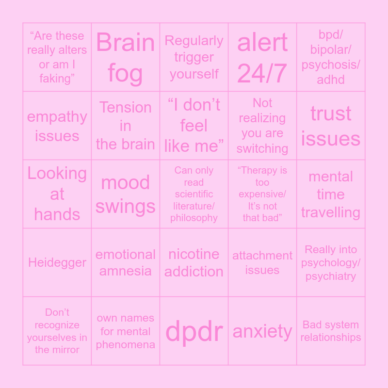 This bingo card has 25 words: emotional amnesia, dpdr, “I don’t feel like me”, Don’t recognize yourselves in the mirror, bpd/ bipolar/ psychosis/ adhd, “Are these really alters or am I faking”, empathy issues, Brain fog, “Therapy is too expensive/ It’s not that bad”, nicotine addiction, Not realizing you are switching, Looking at hands, attachment issues, Really into psychology/ psychiatry, Tension in the brain, Bad system relationships, mental time travelling, Regularly trigger yourself, trust issues, mood swings, Can only read scientific literature/ philosophy, own names for mental phenomena, Heidegger, alert 24/7 and anxiety.