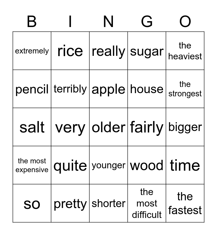 This bingo card has a free space and 29 words: so, too, very, enough, extremely, really, terribly, quite, fairly, pretty, bigger, the fastest, shorter, the most difficult, the strongest, taller, younger, the most expensive, the heaviest, salt, wood, money, house, pencil, sugar, rice, time, apple and burger.