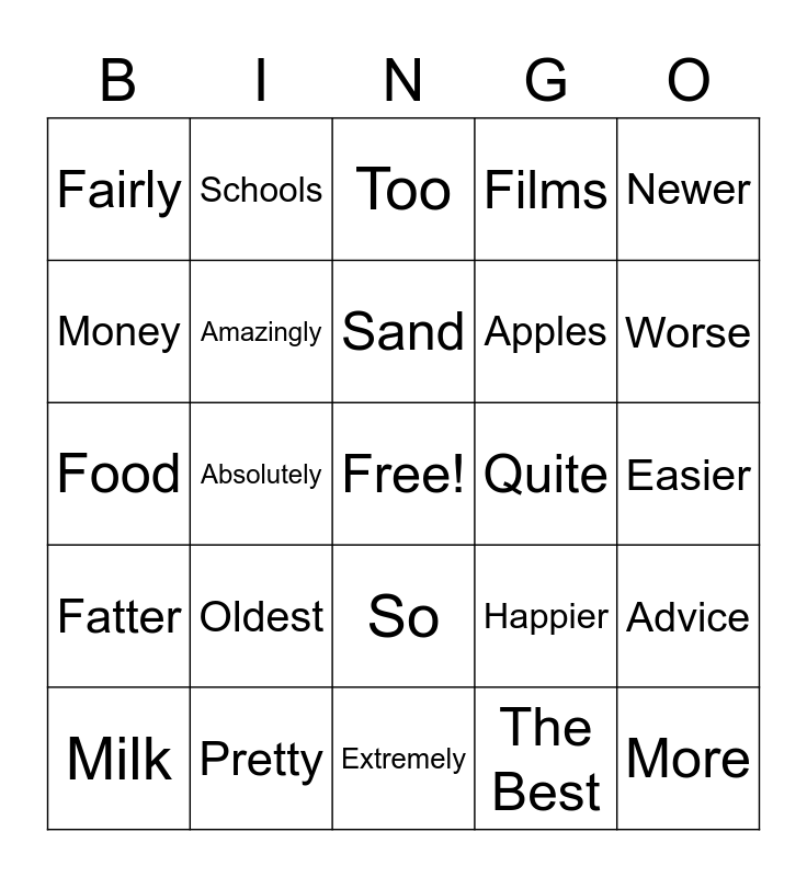 This bingo card has a free space and 30 words: Pretty, Very, Absolutely, Really, Fairly, Too, Amazingly, So, Quite, Extremely, Easier, More, The Best, Farthest, Worse, Tallest, Happier, Fatter, Oldest, Newer, Food, Sugar, Schools, Apples, Money, Films, Advice, Milk, Sand and Time.