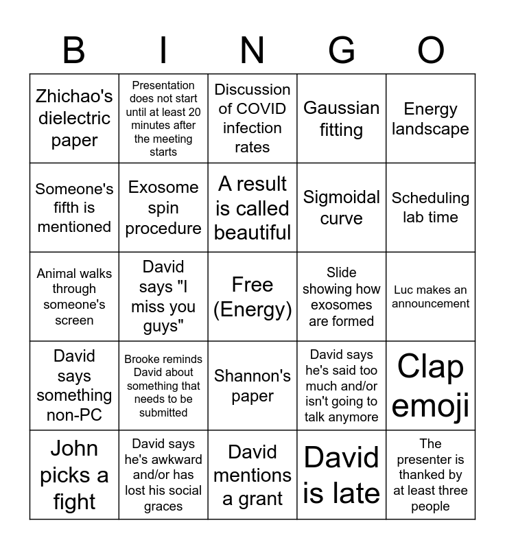 This bingo card has a free space and 24 words: Brooke reminds David about something that needs to be submitted, David says he's awkward and/or has lost his social graces, A result is called beautiful, John picks a fight, Energy landscape, Zhichao's dielectric paper, Someone's fifth is mentioned, Presentation does not start until at least 20 minutes after the meeting starts, Slide showing how exosomes are formed, Shannon's paper, Sigmoidal curve, Animal walks through someone's screen, David says he's said too much and/or isn't going to talk anymore, Clap emoji, Exosome spin procedure, David is late, Luc makes an announcement, Discussion of COVID infection rates, Scheduling lab time, David says "I miss you guys", The presenter is thanked by at least three people, David says something non-PC, Gaussian fitting and David mentions a grant.