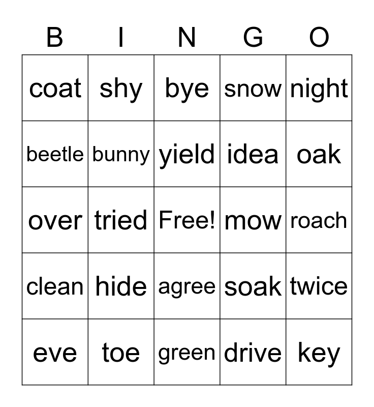 This bingo card has a free space and 24 words: hide, toe, yield, eve, night, coat, beetle, shy, mow, agree, idea, over, soak, twice, bunny, drive, roach, bye, oak, tried, key, clean, snow and green.