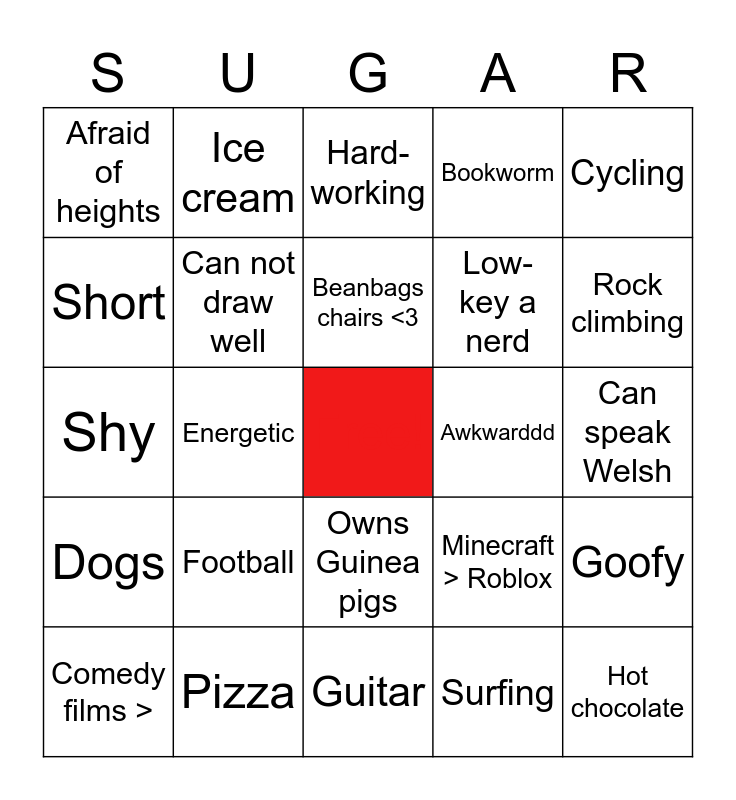 This bingo card has a free space and 24 words: Football, Pizza, Beanbags chairs <3, Comedy films >, Cycling, Afraid of heights, Short, Ice cream, Awkwarddd, Owns Guinea pigs, Low-key a nerd, Shy, Minecraft > Roblox, Goofy, Can not draw well, Surfing, Can speak Welsh, Hard-working, Rock climbing, Energetic, Hot chocolate, Dogs, Bookworm and Guitar.
