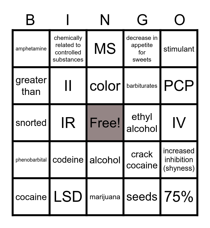 This bingo card has a free space and 29 words: cocaine, hallucinogen, IR, liquid, amphetamine, MS, II, codeine, ethyl alcohol, LSD, IV, 75%, marijuana, seeds, PCP, methadone, alcohol, phenobarbital, stimulant, snorted, crack cocaine, heroin, barbiturates, greater than, decrease in appetite for sweets, chemically related to controlled substances, increased inhibition (shyness), color and liquid hashish.