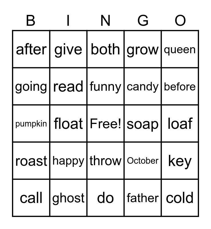 This bingo card has a free space and 37 words: tree, need, clean, read, key, happy, funny, leaf, queen, piece, float, grow, cold, loaf, going, roast, bowl, both, throw, soap, after, before, call, do, earth, father, give, her, know, large, cat, ghost, pumpkin, spider, October, candy and skeleton.