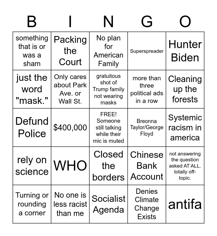 This bingo card has a free space and 29 words: Turning or rounding a corner, Paris Climate accord, $400,000, rolling back regulations, something that is or was a sham, No plan for American Family, Only cares about Park Ave. or Wall St., WHO, Breonna Taylor/George Floyd, No one is less racist than me, Systemic racism in america, antifa, Socialist Agenda, Denies Climate Change Exists, Cleaning up the forests, 220,000 deaths, Closed the borders, rely on science, Hunter Biden, Defund Police, Chinese Bank Account, disrespecting moderator, more than three political ads in a row, just the word "mask.", Superspreader, Packing the Court, not answering the question asked AT ALL. totally off-topic., gratuitous shot of Trump family not wearing masks and green or clean energy.