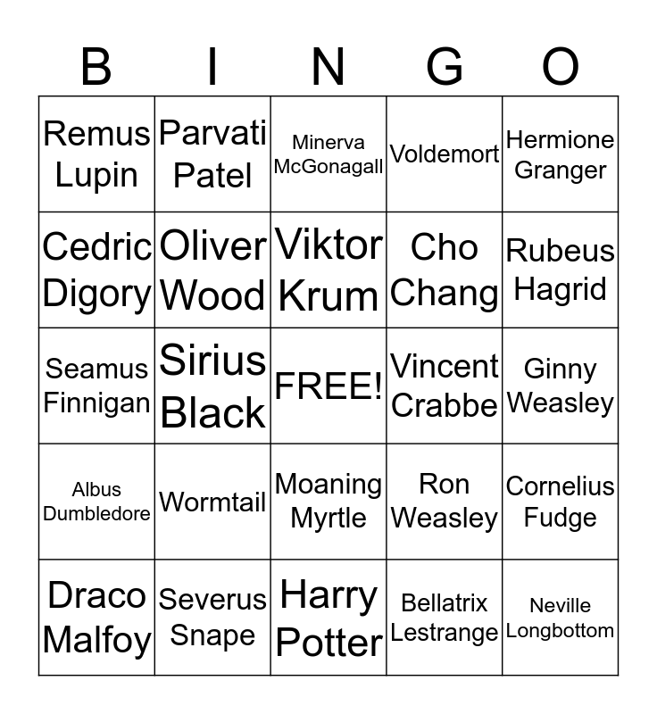 This bingo card has a free space and 24 words: Wormtail, Severus Snape, Viktor Krum, Draco Malfoy, Hermione Granger, Remus Lupin, Cedric Digory, Parvati Patel, Vincent Crabbe, Moaning Myrtle, Cho Chang, Seamus Finnigan, Ron Weasley, Cornelius Fudge, Oliver Wood, Bellatrix Lestrange, Ginny Weasley, Minerva McGonagall, Rubeus Hagrid, Sirius Black, Neville Longbottom, Albus Dumbledore, Voldemort and Harry Potter.