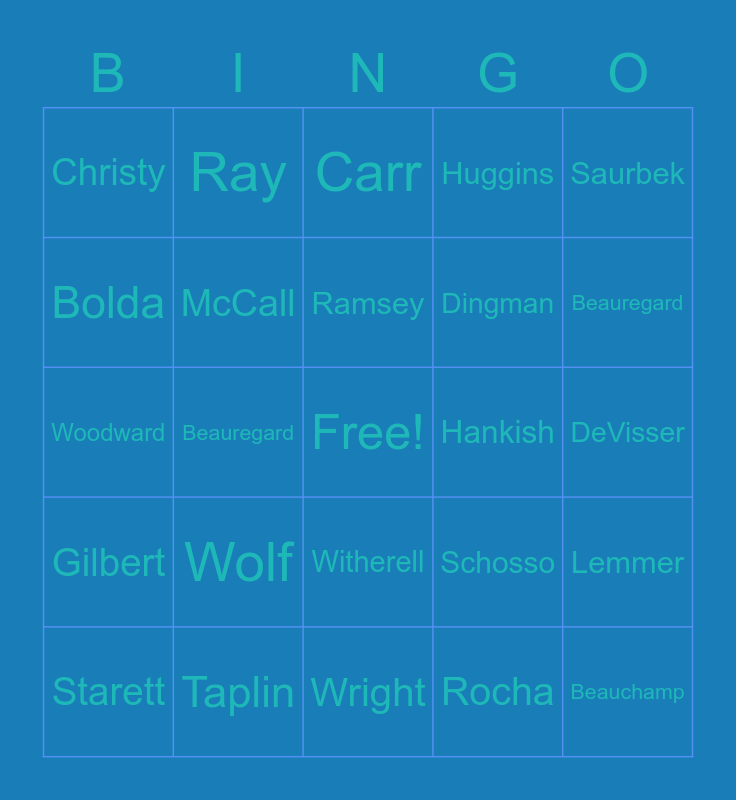 This bingo card has a free space and 24 words: Wolf, Taplin, Ramsey, Starett, Saurbek, Christy, Bolda, Ray, Hankish, Witherell, Dingman, Woodward, Schosso, Lemmer, McCall, Rocha, DeVisser, Carr, Beauregard, Beauregard, Beauchamp, Gilbert, Huggins and Wright.