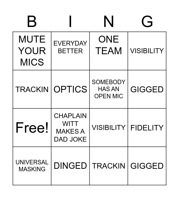 This bingo card has 20 words: FIDELITY, COPY, ONE TEAM, FOR ACTION, UNIVERSAL MASKING, TRACKIN, DINGED, MUTE YOUR MICS, Free!, EVERYDAY BETTER, CHAPLAIN WITT MAKES A DAD JOKE, VISIBILITY, OPTICS, GIGGED, SOMEBODY HAS AN OPEN MIC, HOW COPY, GIGGED, VISIBILITY, TRACKIN and ONE TEAM.