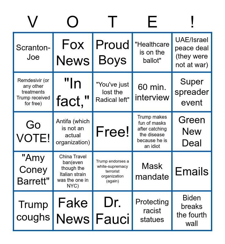 This bingo card has a free space and 39 words: Secret Chinese Bank Account, Hunter Biden, Nancy Pelosi getting a haircut, "In fact,", Trump coughs, Trump endorses a white-supremacy terrorist organization (again), "You've just lost the Radical left", Raising Minimum Wage, UAE/Israel peace deal (they were not at war), "Amy Coney Barrett", Antifa (which is not an actual organization), "Healthcare is on the ballot", Biden breaks the fourth wall, Green New Deal, Trump makes fun of masks after catching the disease because he is an idiot, China Travel ban(even though the Italian strain was the one in NYC), Trump encourages supporters to break the law and intimidate voters, Scranton-Joe, Law and Order, Mask mandate, Remdesivir (or any other treatments Trump received for free), Dr. Fauci, 60 min. interview, Super spreader event, Corruption, Trump children business in China, Sexist comment made by an old man, Biden loses train of thought, COCAINE, Fox News, Fistfight, "Shut up, man" or a similar line, Proud Boys, Fake News, Protecting racist statues, Biden stumbles through a statistic, Emails, Go VOTE! and Racist fear-mongering.