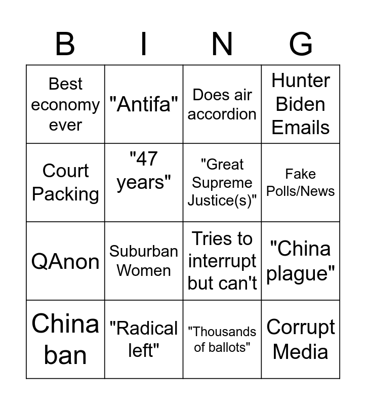 This bingo card has 16 words: "Radical left", "China plague", Does air accordion, Best economy ever, QAnon, "Antifa", Tries to interrupt but can't, "Thousands of ballots", Court Packing, "47 years", China ban, Hunter Biden Emails, Suburban Women, Fake Polls/News, "Great Supreme Justice(s)" and Corrupt Media.