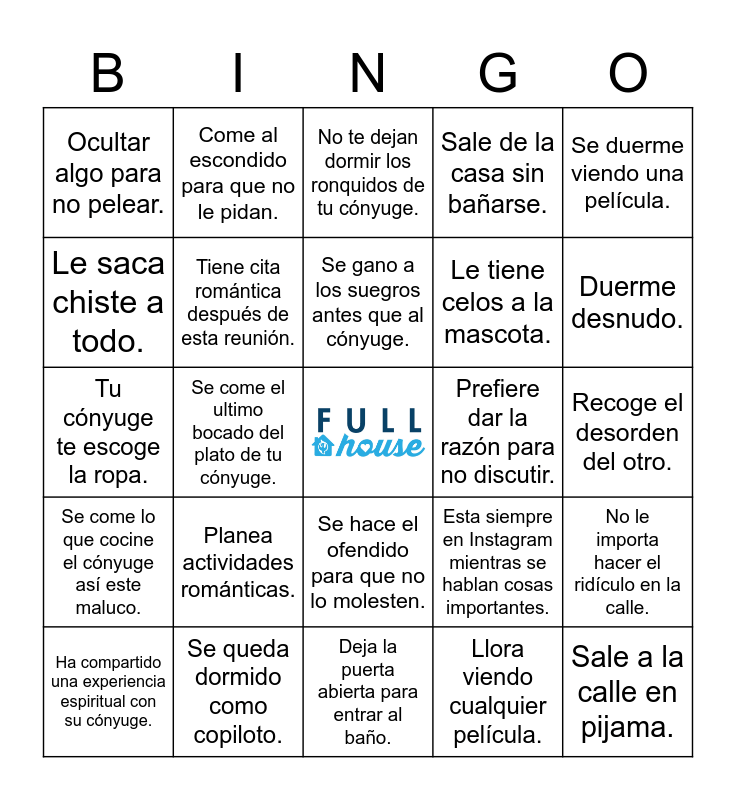 This bingo card has a free space and 40 words: Usa el tiempo libre en redes sociales., Tu cónyuge te escoge la ropa., Tiene más de 30 pares de zapatos., Tiene cita romántica después de esta reunión., Se queda dormido como copiloto., Se hace el ofendido para que no lo molesten., Se gano a los suegros antes que al cónyuge., Se encierra y se demora en el baño para no escuchar cantaleta., Se duerme viendo una película., Se come lo que cocine el cónyuge así este maluco., Se come el ultimo bocado del plato de tu cónyuge., Sale de la casa sin bañarse., Sale a la calle en pijama., Recoge el desorden del otro., Prefiere dar la razón para no discutir., Planea actividades románticas., Pide perdón primero., Ocultar algo para no pelear., No toma las cosas en serio., No te dejan dormir los ronquidos de tu cónyuge., No le importa hacer el ridículo en la calle., Llora viendo cualquier película., Le tiene celos a la mascota., Le saca chiste a todo., Le molesta como come su cónyuge., Le compro un regalo inesperado a su cónyuge., Hacen citas románticas en casa., Hace pasar penas a su cónyuge en la calle., Ha utilizado “Tengo dolor de cabeza” como excusa en la cama., Ha utilizado “Estoy muy cansado/a” como excusa en la cama., Ha orado con su pareja esta semana., Ha compartido una experiencia espiritual con su cónyuge., Estudian la biblia juntos., Esta siempre en Instagram mientras se hablan cosas importantes., Duerme desnudo., Deja la puerta abierta para entrar al baño., Decir mentiras para evitar una pelea., Culpa al cónyuge por el desorden de la casa., Come al escondido para que no le pidan. and Antes muerto/a que sencillo/a.