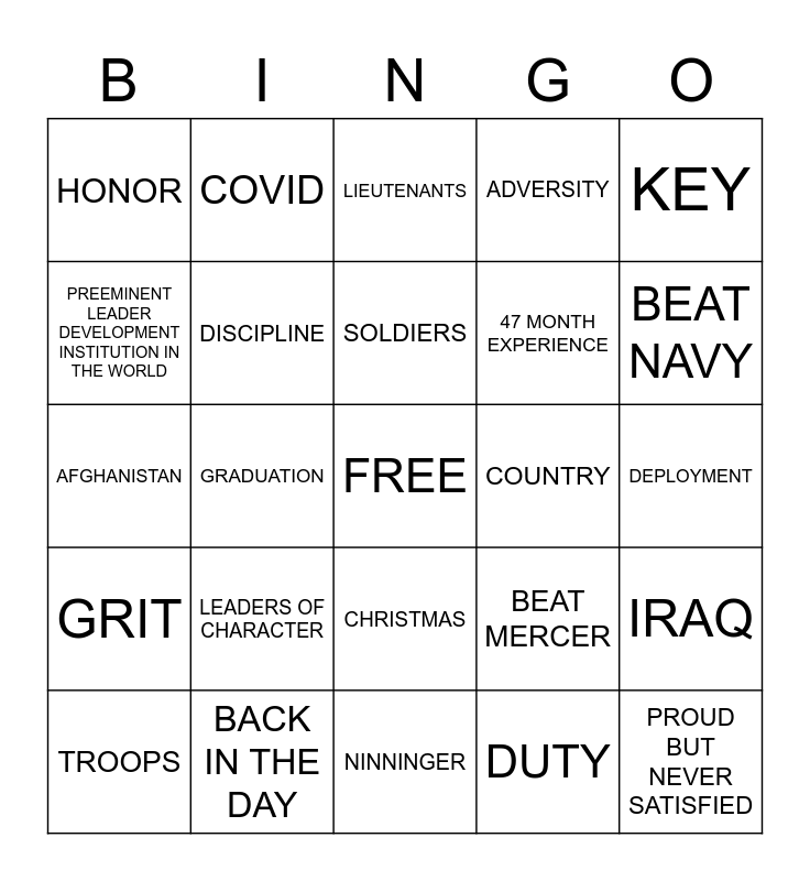 This bingo card has a free space and 24 words: LEADERS OF CHARACTER, BACK IN THE DAY, SOLDIERS, TROOPS, KEY, HONOR, PREEMINENT LEADER DEVELOPMENT INSTITUTION IN THE WORLD, COVID, COUNTRY, CHRISTMAS, 47 MONTH EXPERIENCE, AFGHANISTAN, BEAT MERCER, IRAQ, DISCIPLINE, DUTY, DEPLOYMENT, LIEUTENANTS, BEAT NAVY, GRADUATION, PROUD BUT NEVER SATISFIED, GRIT, ADVERSITY and NINNINGER.