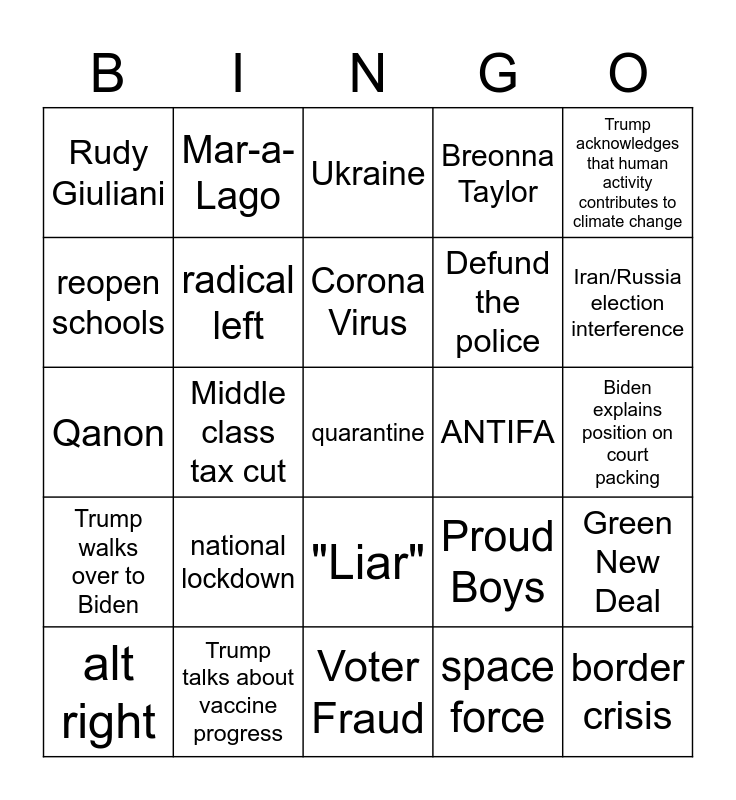 This bingo card has 70 words: Biden won't explain position on court packing, Biden explains position on court packing, 1619 project, Institutionalized racism, Trump talks about vaccine progress, Black Lives Matter, Breonna Taylor, Trump won't say that human activity contributes to climate change, Trump acknowledges that human activity contributes to climate change, Trump says scientists are wrong, Green New Deal, Hunter Biden, Rudy Giuliani, Ukraine, Dr. Fauci, Middle class tax cut, "Liar", Defund the police, "Wrong", Trump walks over to Biden, ANTIFA, Proud Boys, Iran/Russia election interference, Radical mob, Chinese bank account, "tremendous job", "best ever", "many people have said", space force, Either asks the moderator to step in, Mar-a-Lago, Biden references his time as VP, twitter reference, violent protests, Biden says "folks", Hilary Clinton, Worst trade deal, The CDC, communism, reopen schools, border crisis, national lockdown, quarantine, travel ban, masks, radical left, alt right, police violence, interrupts moderator, Europe, illegal immigrants, religious reference, 60 minutes interview, Scranton, Voter Fraud, Covid-19, Corona Virus, Embassy in Jerusalem, George Floyd, Trump says "law and order", Qanon, Paris Climate Accord, 47 years, suburban women, radical left, Biden says "Russian misinformation", Trump says "rounding the corner", Trump mentions cutting taxes, "path to citizenship" and "tuition free" college.