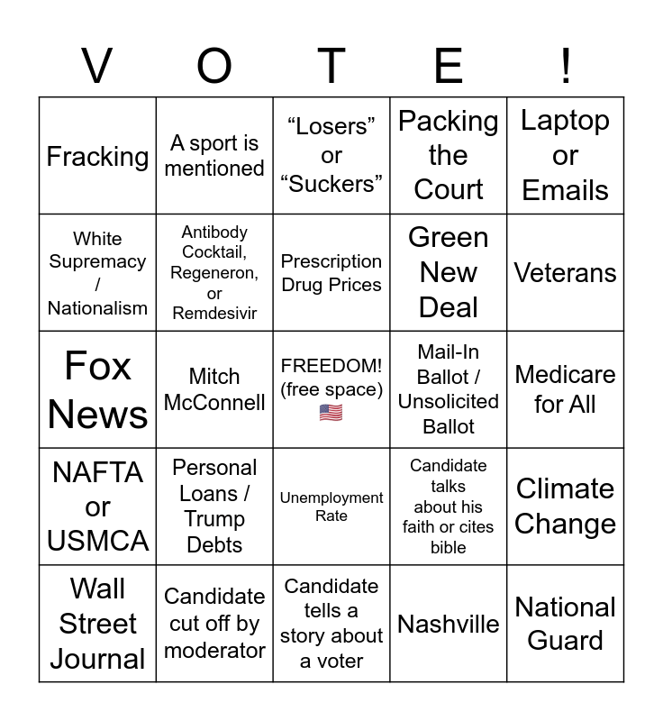 This bingo card has a free space and 100 words: Russia or Putin, Ukraine, Medicare for All, Candidate Age, Twitter or Tweet, Living Wage or Higher Minimum Wage, QAnon, Candidate talks while Muted, Public Option, Obama, Candidate talks about Wife, Hunter Biden, Beau Biden, Candidate cut off by moderator, Rudy Giuliani or Borat, Immigration or Border Wall, Green New Deal, Soleimani, Socialism, Hillary Clinton, Moderator says candidate did not answer question, Moderator fact checks candidate, Tony Bobulinski, “Rigged”, Tariffs, Mail-In Ballot / Unsolicited Ballot, Laptop or Emails, Candidate talks about his faith or cites bible, Foreign Bank Account, Nancy Pelosi, Mitch McConnell, Fracking, Wildfires, William (Bill) Barr, Nashville, Prescription Drug Prices, Climate Change, Lesley Stahl or 60 Minutes, Stimulus Checks, Gretchen Whitmer, Tax Plan, Super-spreader, Fox News, Biden says "Fact of the matter is", Veterans, “Losers” or “Suckers”, Iran, Clemency or Pardons, NATO or UN, Candidate tells a story about a voter, Working Class, “Fake News”, Operation Warp Speed, Candidate mentions a poll, “Soul of the Nation” or “Build Back Better”, Seniors, China, “Sleepy” Joe or Basement, Clean Coal, Packing the Court, George Floyd, Paris Climate Accord, 12 Days, Black Lives Matter, Systemic / Institutional Racism, Affordable Care Act, Brett Kavanaugh or Neil Gorsuch, Amy Coney Barrett, COVID Death Toll or Case Count, Antifa, Defund the Police, Personal Loans / Trump Debts, New York Post, Dr. Scott Atlas, Dr. Anthony Fauci, “Law and Order”, Domestic Terrorism, White Supremacy / Nationalism, $750, We’ll/you’ll “have to see”, Manufacturing Jobs, National Guard, 47 Years, Unemployment Rate, Economic Depression / Recession, A sport is mentioned, Small Business, Pre-existing Condition, World Health Organization (WHO), NAFTA or USMCA, Israel, Section 230, “Clown”, “Joker”, or “Malarkey”, Wall Street Journal, Antibody Cocktail, Regeneron, or Remdesivir, Walter Reed, Bipartisan, Social Security, One of Trump’s Children is Mentioned and “The Big Guy” or “The Chairman”.