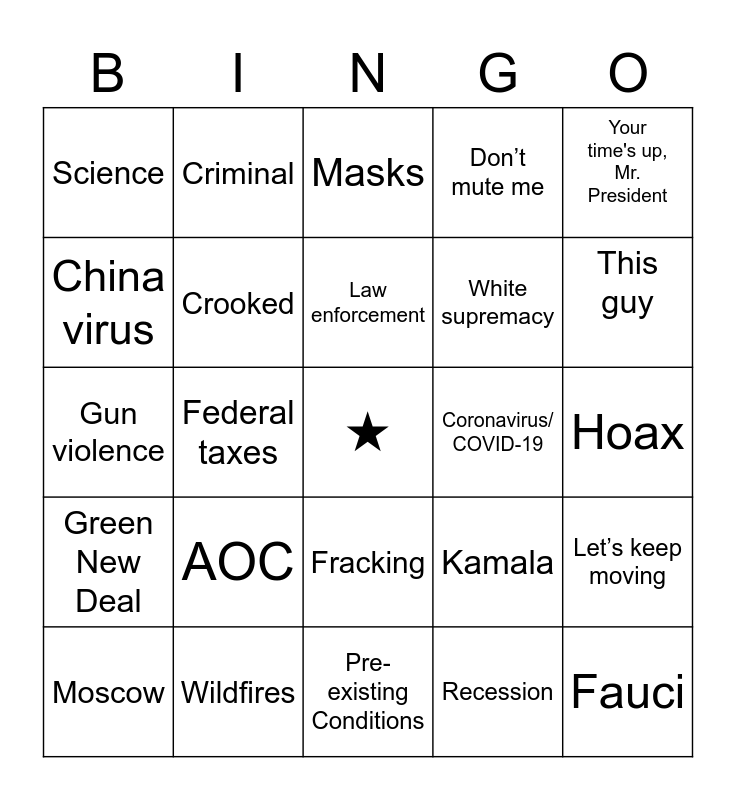 This bingo card has a free space and 69 words: Affordable Care Act, Hoax, Court packing, Racism, Wildfires, California, Don’t mute me, Mail-in Voting, Your time's up, Mr. President, Fake News, Let’s keep moving, Tremendous, Science, Masks, C’mon, Federal taxes, Fracking, White supremacy, Shut down, Green New Deal, Coronavirus/ COVID-19, Kamala, This guy, Any kind of insect is seen or mentioned, Disaster, Vaccine, Radical, Forest management, Recession, Truth, Criminal, Delaware, My generals, Immune, Hunter Biden, Russia, Clown, Folks, China virus, Supreme Court, AOC, Fauci, Giuliani, Bill Barr, Proud boys, Moscow, Antifa, Is this thing on?, Conspiracy, Crooked, Law enforcement, Unmute, Billionaires, Pre-existing Conditions, Law and order, Will I get my time back?, Gold star families, Many, many, many, Decency, Gun violence, Scranton, Reckless, Amy Coney Barrett, Shut up, Shut down, Socialism, Student Loans, Medicare and Military.