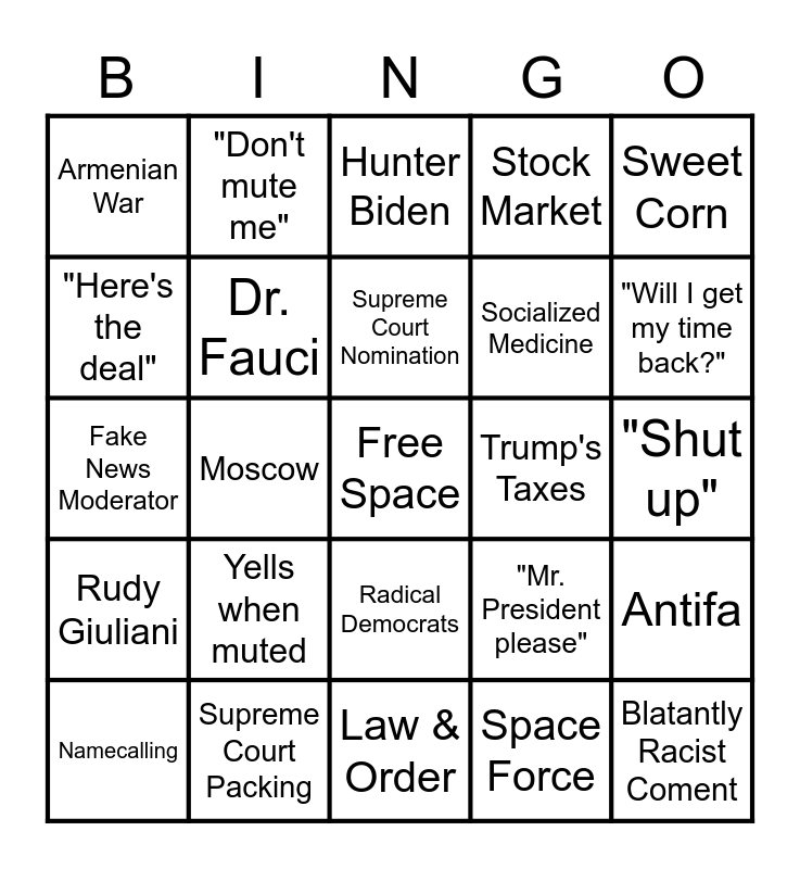 This bingo card has a free space and 24 words: Yells when muted, Supreme Court Packing, Supreme Court Nomination, Namecalling, Sweet Corn, Armenian War, "Here's the deal", "Don't mute me", Trump's Taxes, Radical Democrats, Socialized Medicine, Fake News Moderator, "Mr. President please", Antifa, Dr. Fauci, Space Force, "Shut up", Hunter Biden, "Will I get my time back?", Moscow, Blatantly Racist Coment, Rudy Giuliani, Stock Market and Law & Order.