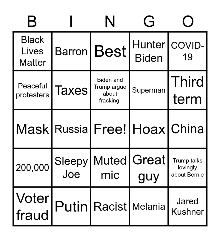 This bingo card has a free space and 38 words: 47 years, Chi-nah, Hunter Biden, Taxes, Trump talks lovingly about Bernie, Sleepy Joe, Biden and Trump argue about fracking., Radical Democrat, COVID-19, Superman, Russia, Hunter Biden, Jared Kushner, China, Peaceful protesters, 200,000, 47 years, Best, Fake news, Hoax, Black Lives Matter, Putin, Third term, Voter fraud, Mail-in ballots, Racist, QAnon, Antifa, Fauci, Socialist, Chinavirus, Muted mic, Melania, Barron, Obama, Great guy, Mask and Fly lands on a candidate.