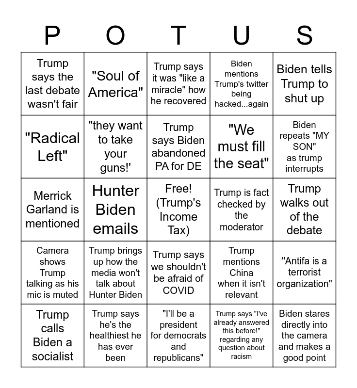 This bingo card has a free space and 24 words: Trump brings up how the media won't talk about Hunter Biden, Trump says he's the healthiest he has ever been, Trump says Biden abandoned PA for DE, Trump calls Biden a socialist, Biden tells Trump to shut up, Trump says the last debate wasn't fair, "Radical Left", "Soul of America", Trump is fact checked by the moderator, Trump says we shouldn't be afraid of COVID, "We must fill the seat", Merrick Garland is mentioned, Trump mentions China when it isn't relevant, "Antifa is a terrorist organization", "they want to take your guns!', Trump says "I've already answered this before!" regarding any question about racism, Trump walks out of the debate, Trump says it was "like a miracle" how he recovered, Biden repeats "MY SON" as trump interrupts, Hunter Biden emails, Biden stares directly into the camera and makes a good point, Camera shows Trump talking as his mic is muted, Biden mentions Trump's twitter being hacked...again and "I'll be a president for democrats and republicans".