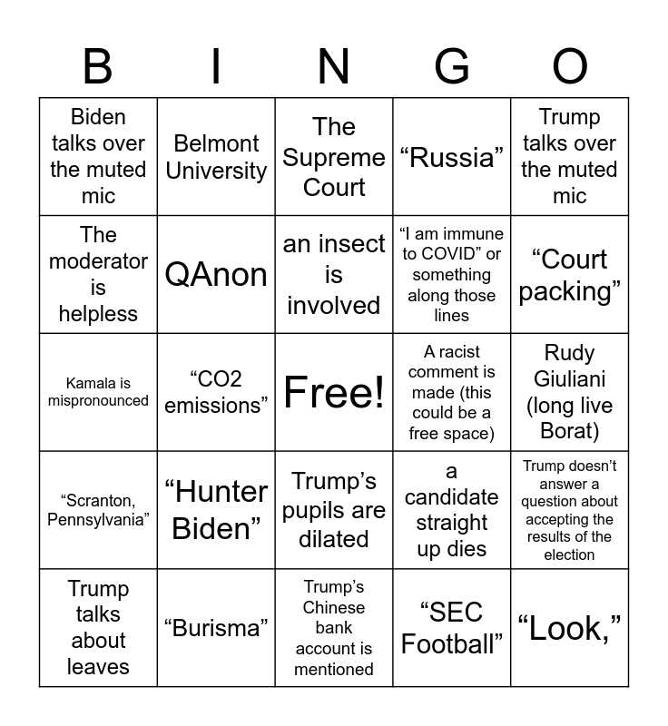 This bingo card has a free space and 24 words: “Hunter Biden”, “Burisma”, an insect is involved, Trump talks about leaves, Trump talks over the muted mic, Biden talks over the muted mic, The moderator is helpless, Belmont University, A racist comment is made (this could be a free space), Trump’s pupils are dilated, “I am immune to COVID” or something along those lines, Kamala is mispronounced, a candidate straight up dies, Trump doesn’t answer a question about accepting the results of the election, QAnon, “SEC Football”, Rudy Giuliani (long live Borat), The Supreme Court, “Court packing”, “CO2 emissions”, “Look,”, “Scranton, Pennsylvania”, “Russia” and Trump’s Chinese bank account is mentioned.