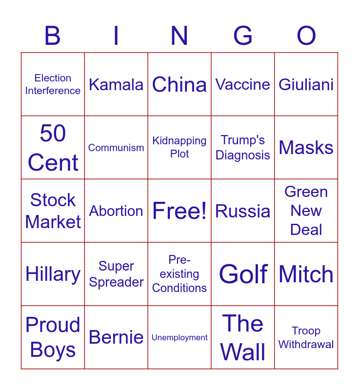 This bingo card has a free space and 29 words: Proud Boys, Antifa, Abortion, Twitter, Election Interference, China, Communism, Super Spreader, Russia, Bernie, Green New Deal, Troop Withdrawal, Unemployment, The Wall, Masks, Coal, Pre-existing Conditions, Hillary, Giuliani, Stock Market, Golf, Hunter, Trump's Diagnosis, 50 Cent, Vaccine, Kamala, Mitch, Kidnapping Plot and Kanye.