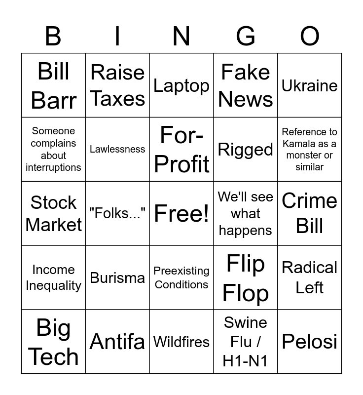 This bingo card has a free space and 32 words: Swine Flu / H1-N1, Trojan Horse, "Folks...", Economy, Income Inequality, Lawlessness, Ukraine, Radical Left, Raise Taxes, Rudy, For-Profit, Laptop, Hoax, Someone complains about muting, We'll see what happens, Russia, Big Tech, Stock Market, Preexisting Conditions, Burisma, Flip Flop, Crooked Hillary, Crime Bill, Antifa, Pelosi, Fake News, Rigged, Someone complains about interruptions, Bill Barr, Wildfires, Court Packing and Reference to Kamala as a monster or similar.