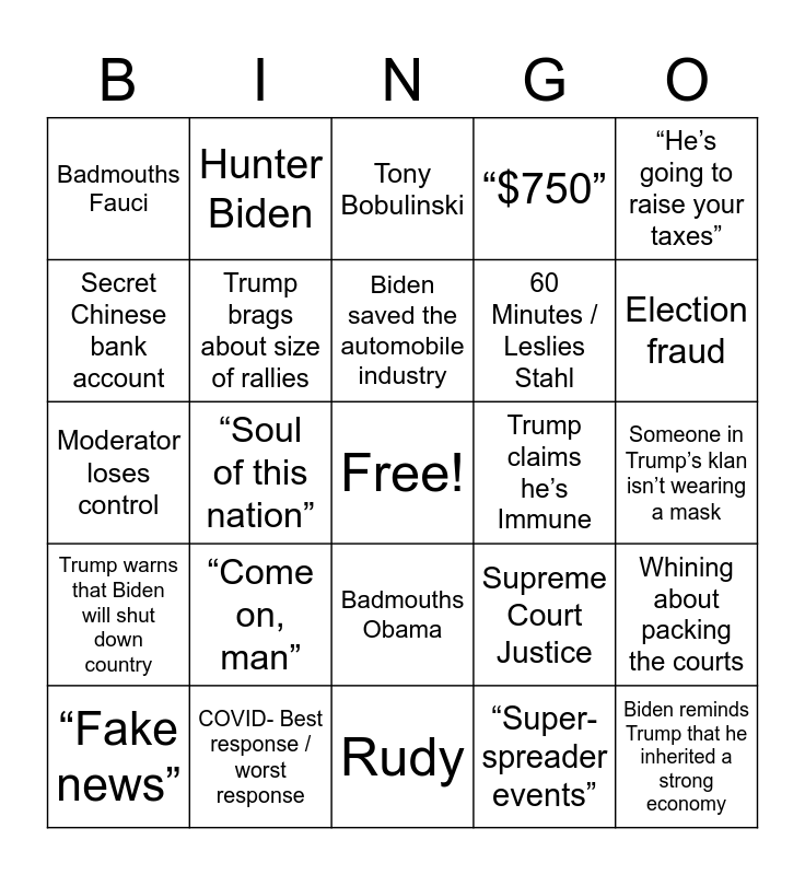 This bingo card has a free space and 24 words: “Come on, man”, COVID- Best response / worst response, Biden saved the automobile industry, “Fake news”, “He’s going to raise your taxes”, Badmouths Fauci, Secret Chinese bank account, Hunter Biden, Trump claims he’s Immune, Badmouths Obama, 60 Minutes / Leslies Stahl, Moderator loses control, Supreme Court Justice, Whining about packing the courts, Trump brags about size of rallies, “Super-spreader events”, Someone in Trump’s klan isn’t wearing a mask, Tony Bobulinski, Election fraud, “Soul of this nation”, Biden reminds Trump that he inherited a strong economy, Trump warns that Biden will shut down country, “$750” and Rudy.