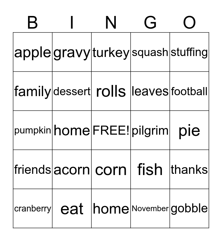 This bingo card has a free space and 24 words: acorn, eat, rolls, cranberry, stuffing, apple, family, gravy, pilgrim, corn, leaves, pumpkin, fish, thanks, dessert, November, pie, turkey, football, home, gobble, friends, squash and home.