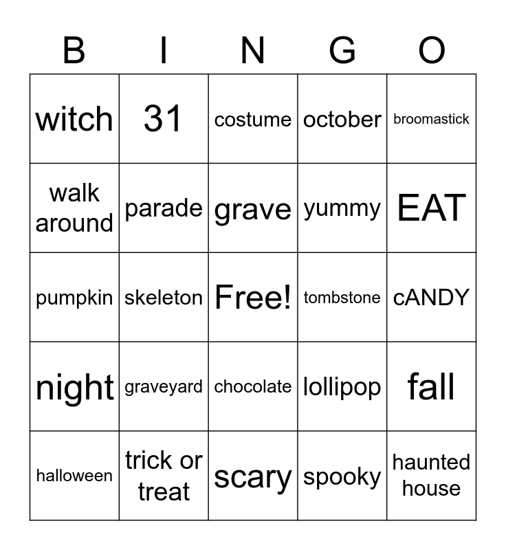 This bingo card has a free space and 29 words: halloween, ghost, skeleton, zombie, witch, costume, parade, graveyard, tombstone, trick or treat, cANDY, haunted house, scary, spooky, EAT, scream, chocolate, night, broomastick, pumpkin, lollipop, jacko lantern, yummy, walk around, october, 31, fall, grave and 10 month.