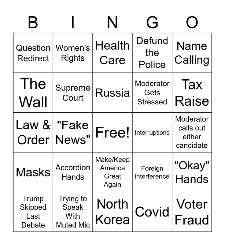 This bingo card has a free space and 24 words: Accordion Hands, Trying to Speak With Muted Mic, Russia, Trump Skipped Last Debate, Name Calling, Question Redirect, The Wall, Women's Rights, Interruptions, Make/Keep America Great Again, Moderator Gets Stressed, Law & Order, Foreign interference, "Okay" Hands, Supreme Court, Covid, Moderator calls out either candidate, Health Care, Tax Raise, "Fake News", Voter Fraud, Masks, Defund the Police and North Korea.