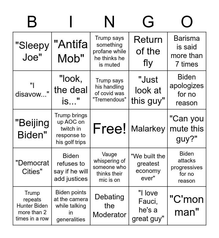 This bingo card has a free space and 25 words: Biden refuses to say if he will add justices, Debating the Moderator, Trump says his handling of covid was "Tremendous", Trump repeats Hunter Biden more than 2 times in a row, Barisma is said more than 7 times, "Sleepy Joe", "I disavow...", "Antifa Mob", Malarkey, Vauge whispering of someone who thinks their mic is on, "Just look at this guy", "Beijing Biden", "We built the greatest economy ever", Biden attacks progressives for no reason, "look, the deal is...", "The beautiful people of...", "Can you mute this guy?", Trump says something profane while he thinks he is muted, Biden apologizes for no reason, Trump brings up AOC on twitch in response to his golf trips, "C'mon man", Biden points at the camera while talking in generalities, "Democrat Cities", Return of the fly and "I love Fauci, he's a great guy".