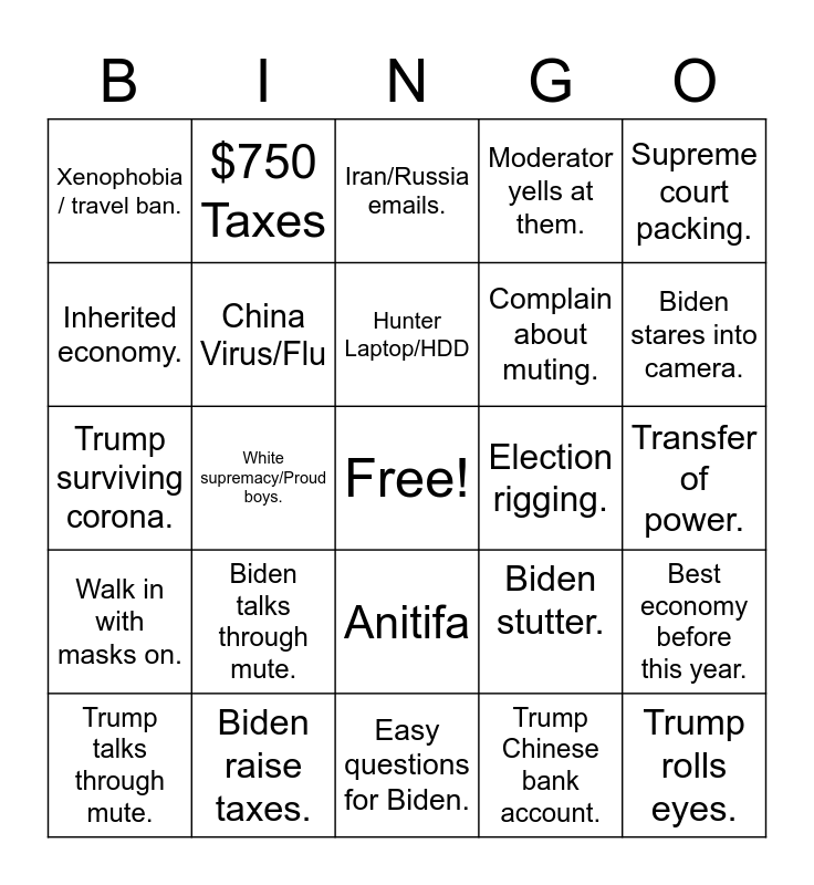 This bingo card has a free space and 24 words: Trump talks through mute., Biden talks through mute., Hunter Laptop/HDD, Trump Chinese bank account., Supreme court packing., Xenophobia / travel ban., $750 Taxes, Iran/Russia emails., Election rigging., Transfer of power., Trump surviving corona., China Virus/Flu, Biden stutter., Best economy before this year., Inherited economy., Biden raise taxes., Easy questions for Biden., Moderator yells at them., Biden stares into camera., Walk in with masks on., White supremacy/Proud boys., Anitifa, Complain about muting. and Trump rolls eyes..
