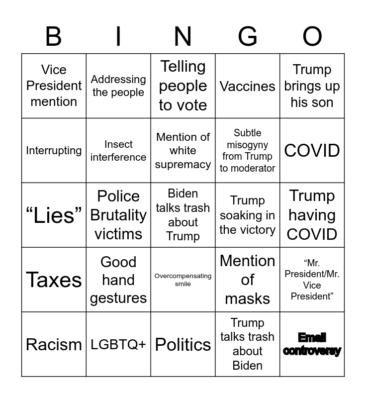 This bingo card has 25 words: Taxes, LGBTQ+, Biden talks trash about Trump, Trump talks trash about Biden, Trump brings up his son, Vice President mention, Addressing the people, Telling people to vote, Trump soaking in the victory, “Mr. President/Mr. Vice President”, Interrupting, Insect interference, Politics, Mention of masks, COVID, Racism, Police Brutality victims, Mention of white supremacy, Subtle misogyny from Trump to moderator, Trump having COVID, “Lies”, Good hand gestures, Overcompensating smile, Vaccines and Email controversy.