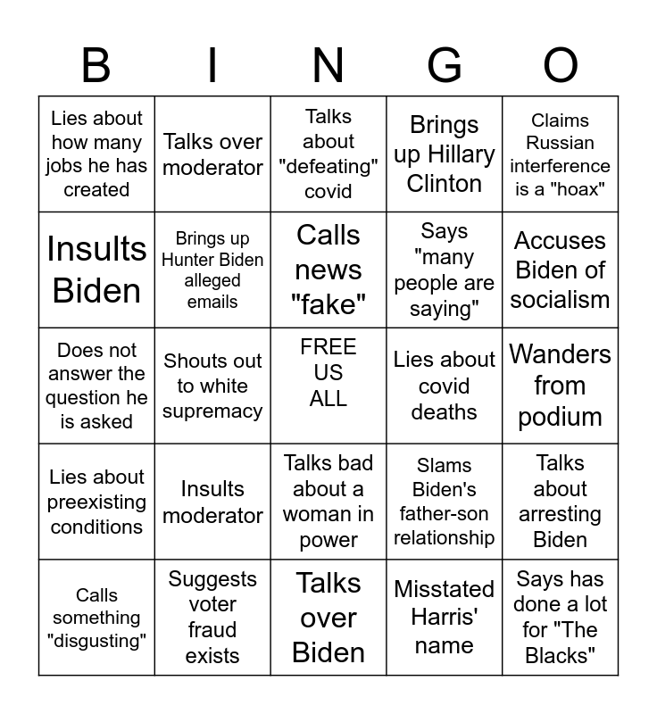 This bingo card has a free space and 24 words: Insults moderator, Suggests voter fraud exists, Calls news "fake", Calls something "disgusting", Claims Russian interference is a "hoax", Lies about how many jobs he has created, Insults Biden, Talks over moderator, Lies about covid deaths, Talks bad about a woman in power, Says "many people are saying", Does not answer the question he is asked, Slams Biden's father-son relationship, Talks about arresting Biden, Brings up Hunter Biden alleged emails, Misstated Harris' name, Wanders from podium, Talks about "defeating" covid, Accuses Biden of socialism, Shouts out to white supremacy, Says has done a lot for "The Blacks", Lies about preexisting conditions, Brings up Hillary Clinton and Talks over Biden.