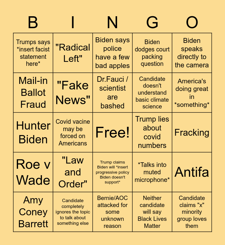 This bingo card has a free space and 24 words: "Law and Order", Candidate completely ignores the topic to talk about something else, Dr.Fauci / scientist are bashed, Amy Coney Barrett, Biden speaks directly to the camera, Trumps says *insert facist statement here*, Mail-in Ballot Fraud, "Radical Left", Trump lies about covid numbers, Trump claims Biden will *insert progressive policy Biden doesn't support*, Candidate doesn't understand basic climate science, Hunter Biden, *Talks into muted microphone*, Antifa, "Fake News", Neither candidate will say Black Lives Matter, Fracking, Biden says police have a few bad apples, America's doing great in *something*, Covid vacine may be forced on Americans, Candidate claims "x" minority group loves them, Roe v Wade, Biden dodges court packing question and Bernie/AOC attacked for some unknown reason.