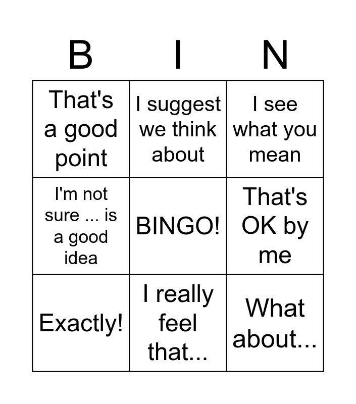 This bingo card has a free space and 8 words: I'm not sure ... is a good idea, I suggest we think about, That's OK by me, Exactly!, I see what you mean, That's a good point, I really feel that... and What about....