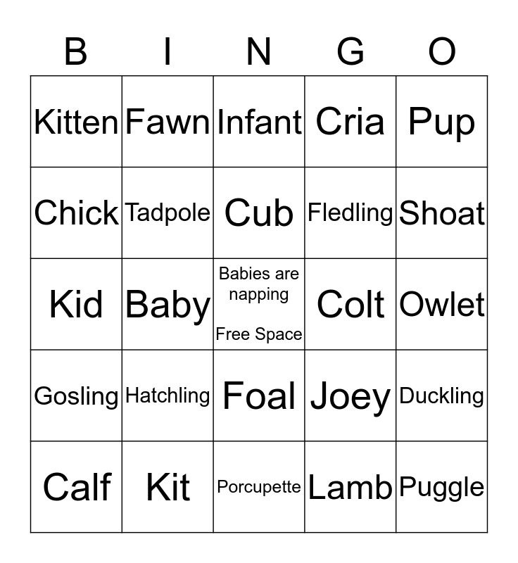 This bingo card has a free space and 24 words: Hatchling, Kit, Cub, Calf, Pup, Kitten, Chick, Fawn, Colt, Foal, Fledling, Kid, Joey, Duckling, Tadpole, Lamb, Owlet, Infant, Shoat, Baby, Puggle, Gosling, Cria and Porcupette.